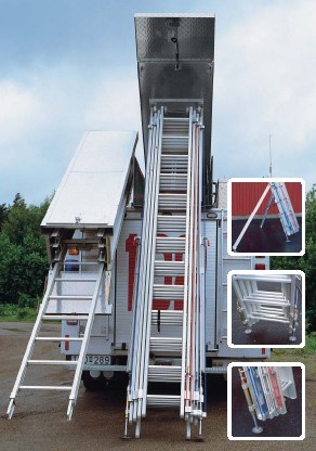 Þrískiptir Wibe stigar. Með reipi til að auðvelda uppsetningu. Hjól efst á stiga. Nylon klæddir að innan til að auðveldara sé að draga upp. Læsing stiganna höfð utan á kjálkum stiganna. Þykkt 210mm. Á kjálkum eru hæðar stillar, óháðir hvor öðrum en hæðarmismunur getur verið allt að 20 sm. Stilltir með höndum eða vökvadrifnir. Einnig fylgja með stuðningsfætur. Hægt er að fá sérstaka stigafestingu á þak slökkvibifreiðar sem rennir stiga af þaki við losun.