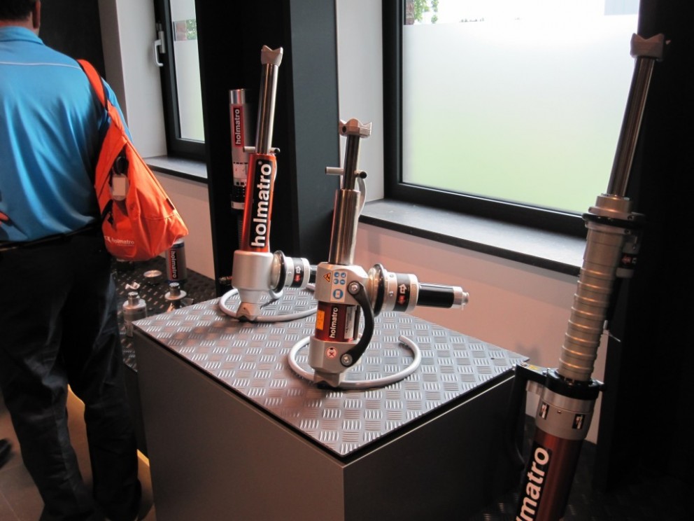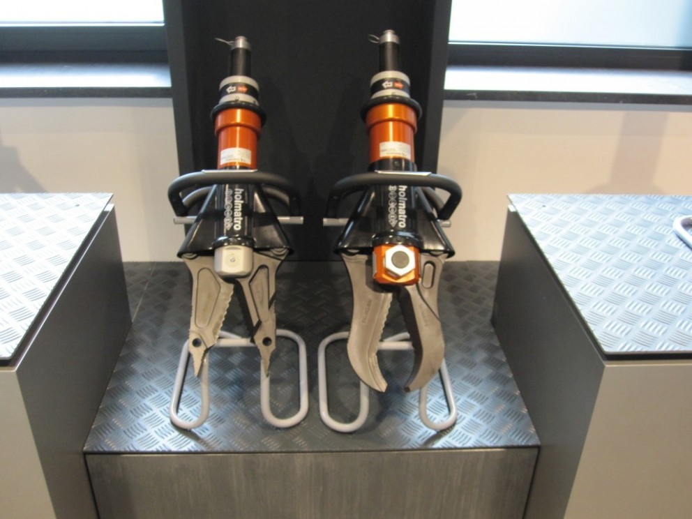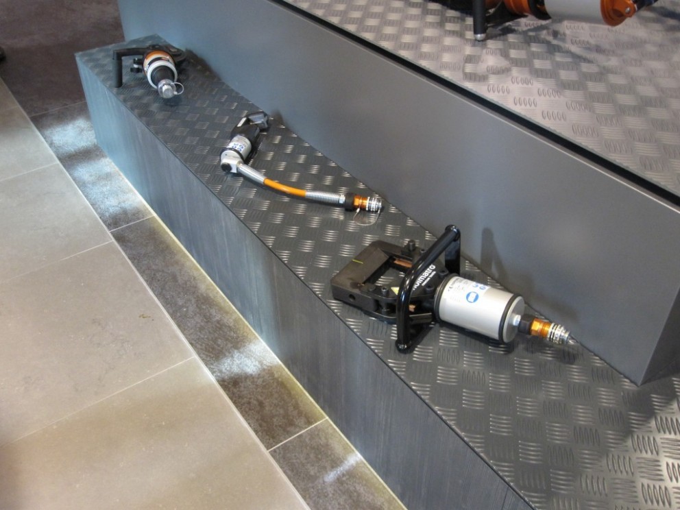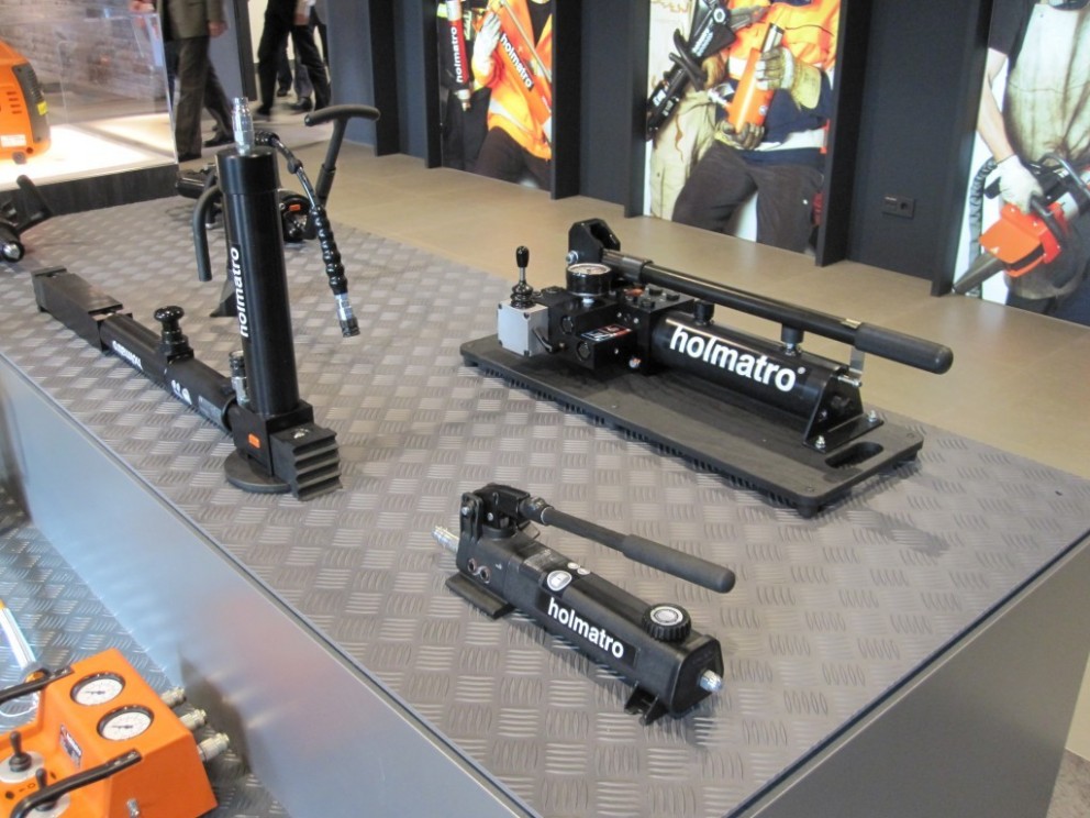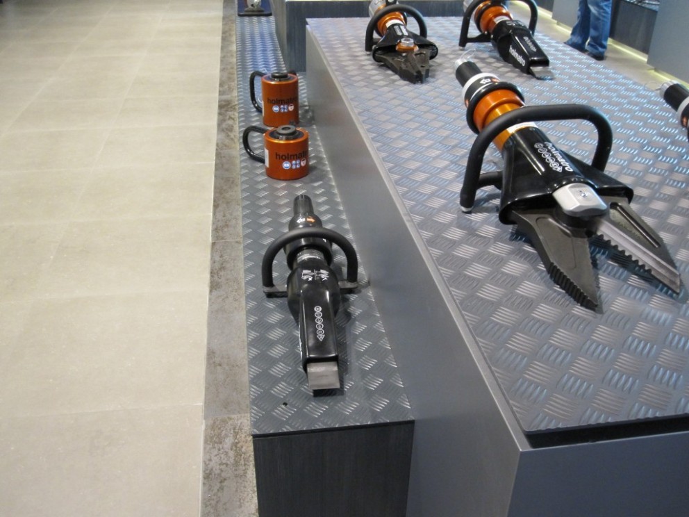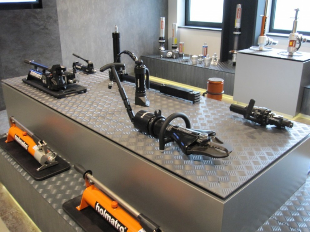 Hér má sjá sýningarsal Holmatro í Hollandi. Hér eru þó ekki nýjustu gerðirnar þ.e. Spider dælur og Greenline rafhlöðudrifna dælan