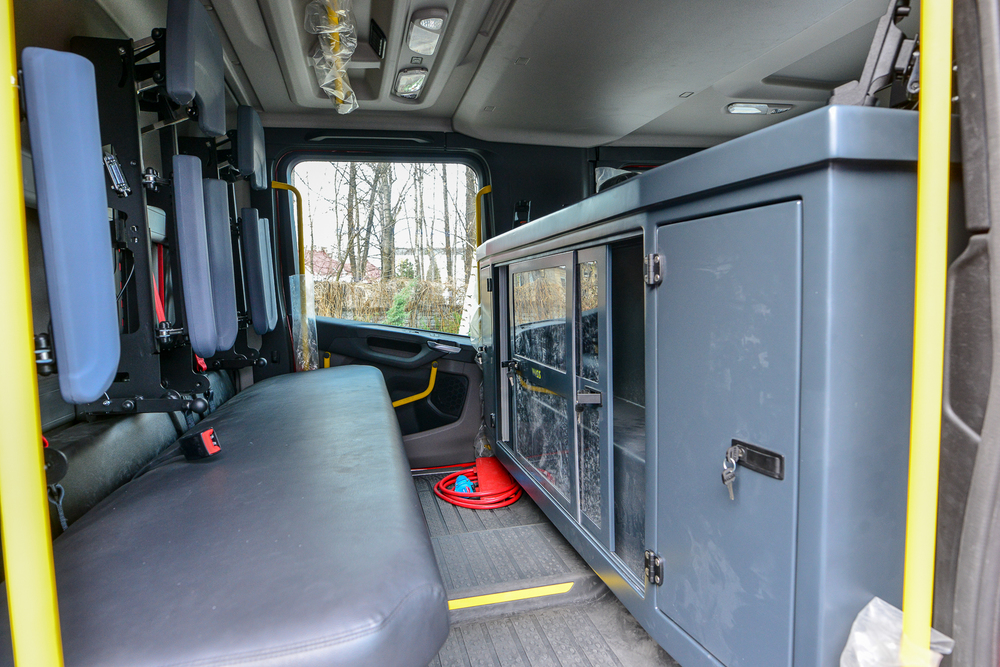 Innrétting yfirbyggingar, pallar og skúffur: Öll gólf í skápum eru gerð úr sléttu ryðfríu stáli og er mjög auðvelt að halda því hreinu. Veggir skápa eru klæddir með gataplötum til að festa búnað og innréttingar og eins til að auðvelda breytingar á innréttingum. Álprófílar sem eru stillanlegir í hæð eða breidd í skápum fyrir hillur og innréttingar eins og hillum, kössum, útdraganlegum og/eða snúanlegum veggjum ásamt útdraganlegum skúffum sem má fella niður. Einnig er geymslukassi á þaki sem rúmar barka, sópa, kústa og sinuklöppur. Kassinn er þéttur gagnvart vatni og ryki.