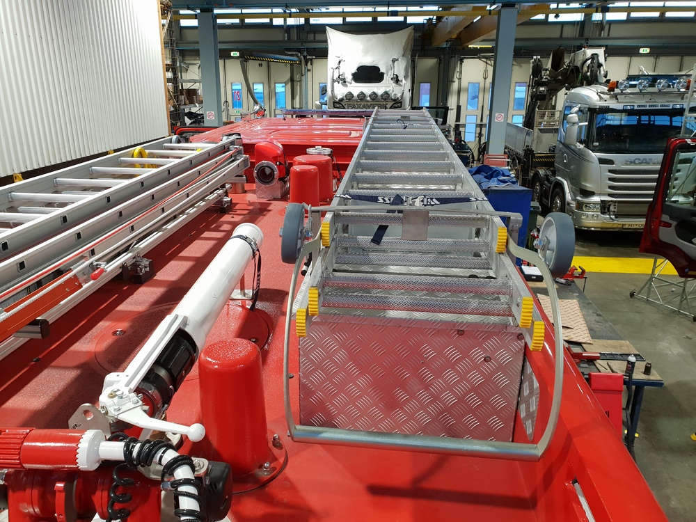 Stigi - Aukahlutir: 10m. stigi í festingum á þaki, þrískiptur. Rafstýrður hjálparbúnaður við losun. Einnig er styttri gerð af stiga og krókstigi (BAS). Stigarnir eru CE merktir til slökkvistarfa.