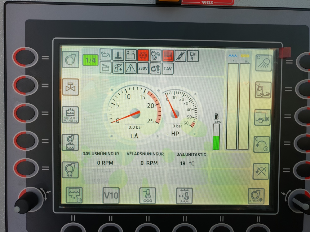 Stjórnborð dælu: CanBus skjáir til stýringar dælu, vinnuljósa, ljósamasturs o.fl. eru í dæluskáp og eins í ökumannshúsi. Innsetning dælu er í dæluskáp en einnig möguleg úr ökumannshúsi. Skjár er í ökumannshúsi. Viðvörun fyrir vatns og froðutank, ljósamastur og úðabyssu. Viðvaranir sem sýna hurðir opnar, hleðslutengingu, skápaljós og fl. Skjárinn í dæluskáp sýnir myndrænt allar upplýsingar sem þörf er á m.a. ástandslýsingar. Flett er á milli skjáa á einfaldan hátt, aðgerðarskjár, stöðuskjár, lagnaskjár, ástandsskjár, allt er í sama skjánum. Vísamælar eru aukalega fyrir sog, háþrýsting, lágþrýsting og þrýsting inn á vatnstank. Margs konar viðvaranir fyrir m.a. olíuþrýsting, vélarhita, aflúttak, loftbólumyndun ofl. Gangráður og hraðastýring dælu. Vinnuljósarofi og skápaljósarofi. Vatns og froðumagn sýnt á grafískan hátt. Neyðarstopprofi. Loftlokar fyrir vatns og froðutank, fyrir tankáfyllingu um dælu (1.700 l/mín) , fyrir að opna vatn að dælu frá tanki, til að opna og loka fyrir slönguhjól og fyrir aftöppun á tanki. Hægt er að forrita ýmsa aðra möguleika m.a. á stýringar á vinnuljósum, skápaljósum, bláum ljósum, ofl. Hægt er að nota dælu bifreiðar og helstu aðgerðir ef stjórnborð bilar.