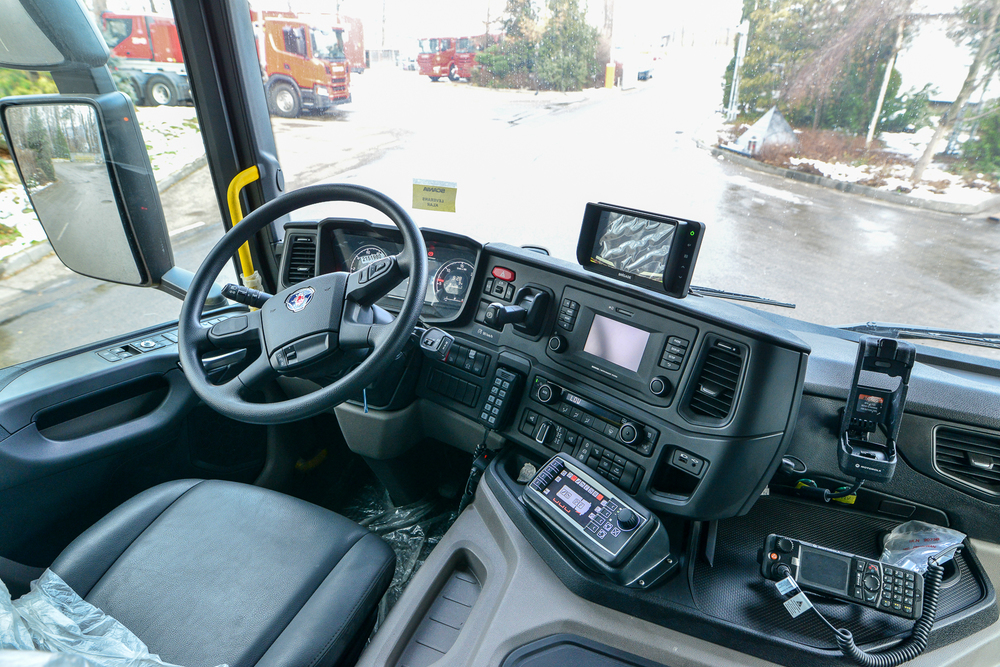 Ökumannshús: Tvöfalt, fjórar hurðir. Hús frá framleiðanda undirvagns. Hefðbundir áhafnarhús af gerðinni CP28 nýja gerðin. Hæð frá gólfi og upp í þak er 1500mm. Hefðbundnar slökkvibifreiðar innréttingar. Rafstýrðar rúður. Skápur með hillum á milli fram og afturhluta. Í skáp eru innstungur fyrir húsarafmagn, rafstöðvarrafmagn og frá Inverter. Öllum miðstöðvum er stýrt úr ökumannshúsi. Handföng fyrir farþega þar sem þörf er á. Sjálfvirk opnun á þrepum fyrir afturhurðir. Lýsing fyrir fram og afturhluta sem truflar ekki ökumann í akstri. Allir í öryggisbeltum. Loftkæling er í bifreiðinni.
