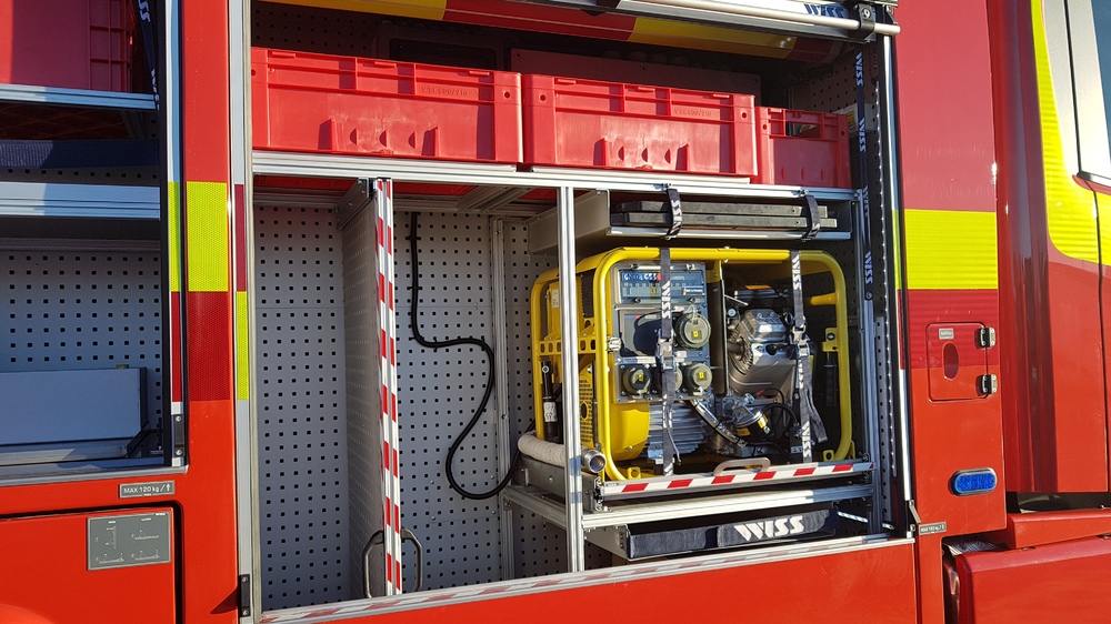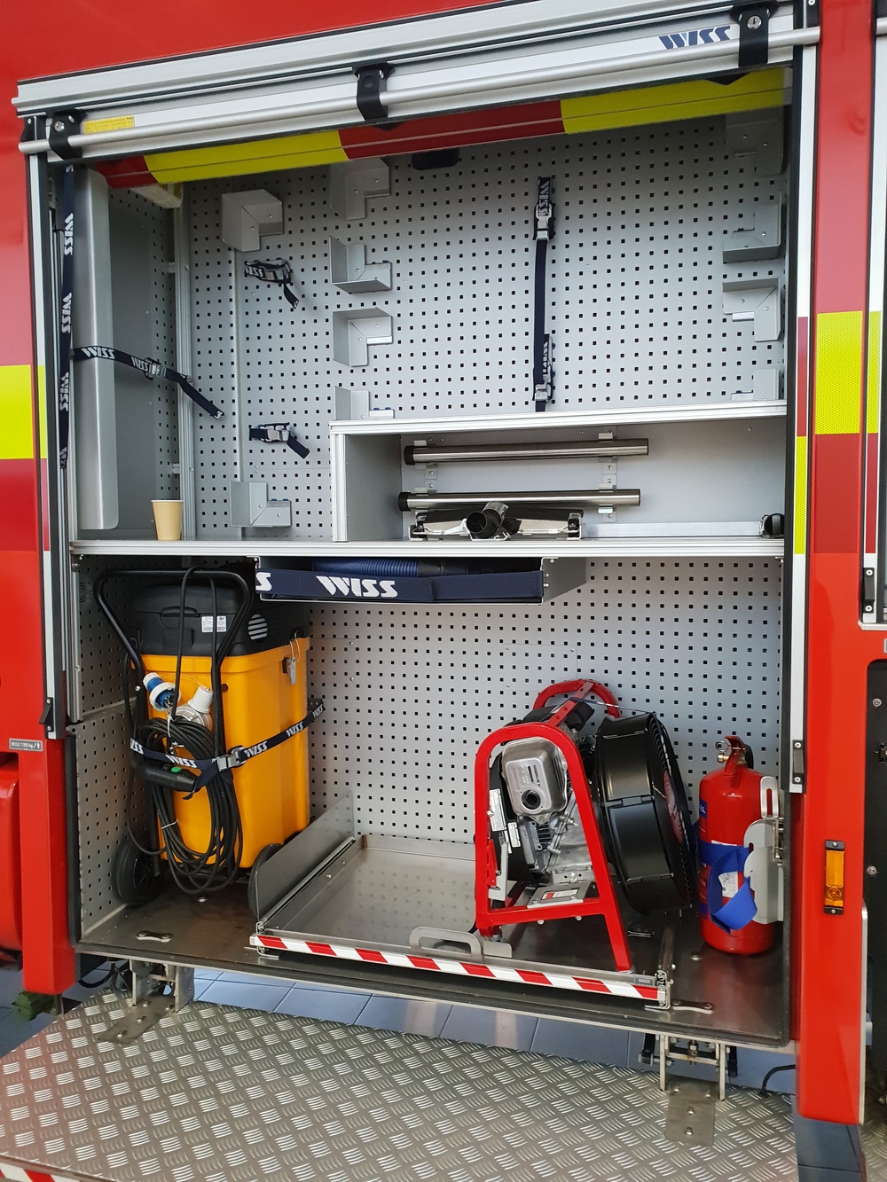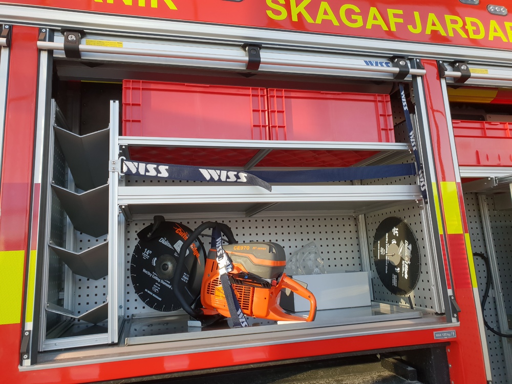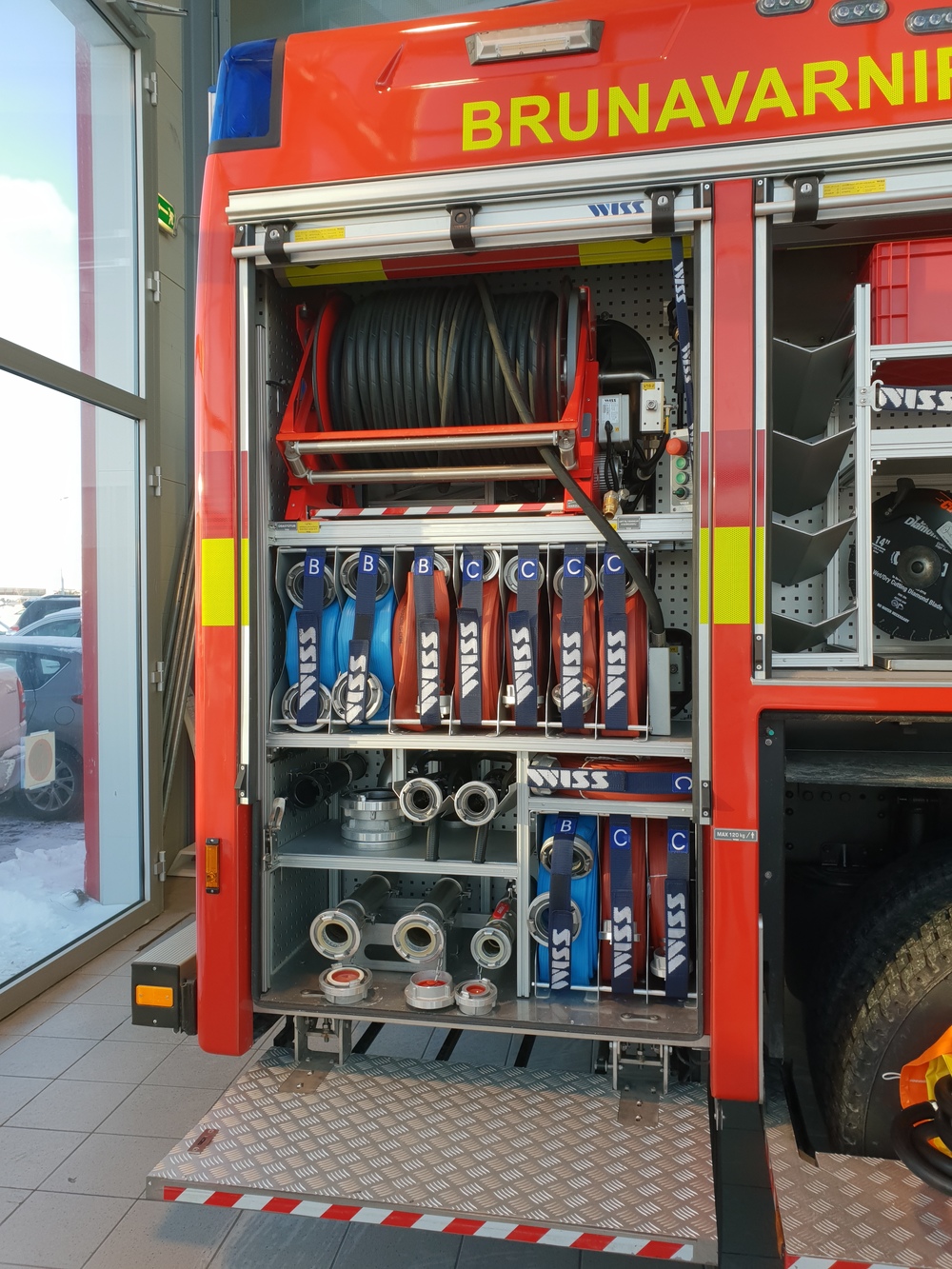 Eftirfarandi búnaður var settur í bifreiðina og er tryggilega festur á sem hagkvæmastan hátt með tilliti til nýtingu pláss í bílnum: 300m. af 3“ Guardsman bláum gúmmíslöngum með Storz B75 tengjum í 20 m. rúllum í slöngurekkum. 160m. af 1 ½“ Guardman rauðum gúmmíslöngum með Storz C52 tengjum í 20 m. rúllum í slöngurekkum ásamt 2 stk. af Protek 366 úðastútum m/handfangi. 160m. af 2“ Guardsman rauðum gúmmíslöngum með Storz C52 tengjum í slöngurekkum ásamt 2 stk. af Protek 366 úðastútum m/handfangi. Cutters Edge 14“ CE970RH214A hjólsög í viðeigandi festingum. Spilliefnasuga Vetter Oil Water Debris Aspirator sem getur sogið upp vatn og olíur. Ramfan GF164SE yfirþrýstingsblásari. MC2 froðustútur 200l/mín. Holmatro sett af háþrýsti og lágþrýstipúðum. Holmatro Háþrýstisett HLB 29 og HBL31 og DCS10U stýribúnaður í kassa 29 og 31 tonna. Lágþrýstipúðasett LAB9U ásamt stýribúnaði. Á útdraganlega vegg verður komið fyrir Holmatro 5000 vökvadrifnu björgunarsetti. FlIR K33 hitamyndavél er í áhafnarhúsi. Öryggislínur fyrir reykkafara verður komið fyrir. A110 Flotsigti er komið fyrir á þaki. Verkfærakassi með helstu verkfærum fylgir bifreiðinni.