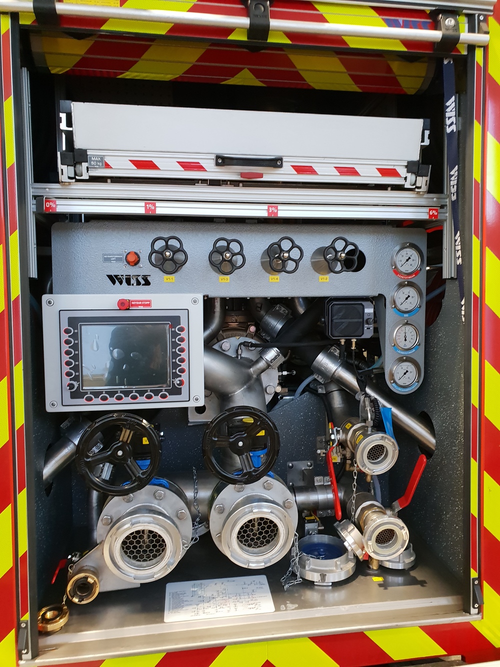 Inntök/Úttök: 4 stk. 75mm úttök til hliðarskápa með skrúfuðum Storz B75 lokum tvívirkum (AWG) í dæluskáp. Tvö 52mm C52 úttök í hliðarskápum með kúlulokum. Loftstýrt inntak frá t.d. brunahana inn á vatnstank í dæluskáp, 75mm með Storz B75 tengi og loka. Inntök á dælu í dæluskáp 2 stk 125mm Storz með stýriskrúfuðum spjaldlokum. 1 stk 75mm Storz B75 með loka inn á dælu. Úttak á slöngukefli. 52mm rör til áfyllingar tanks með dælu og loftloki þar á. 125mm pípulögn frá dælu til tanks.