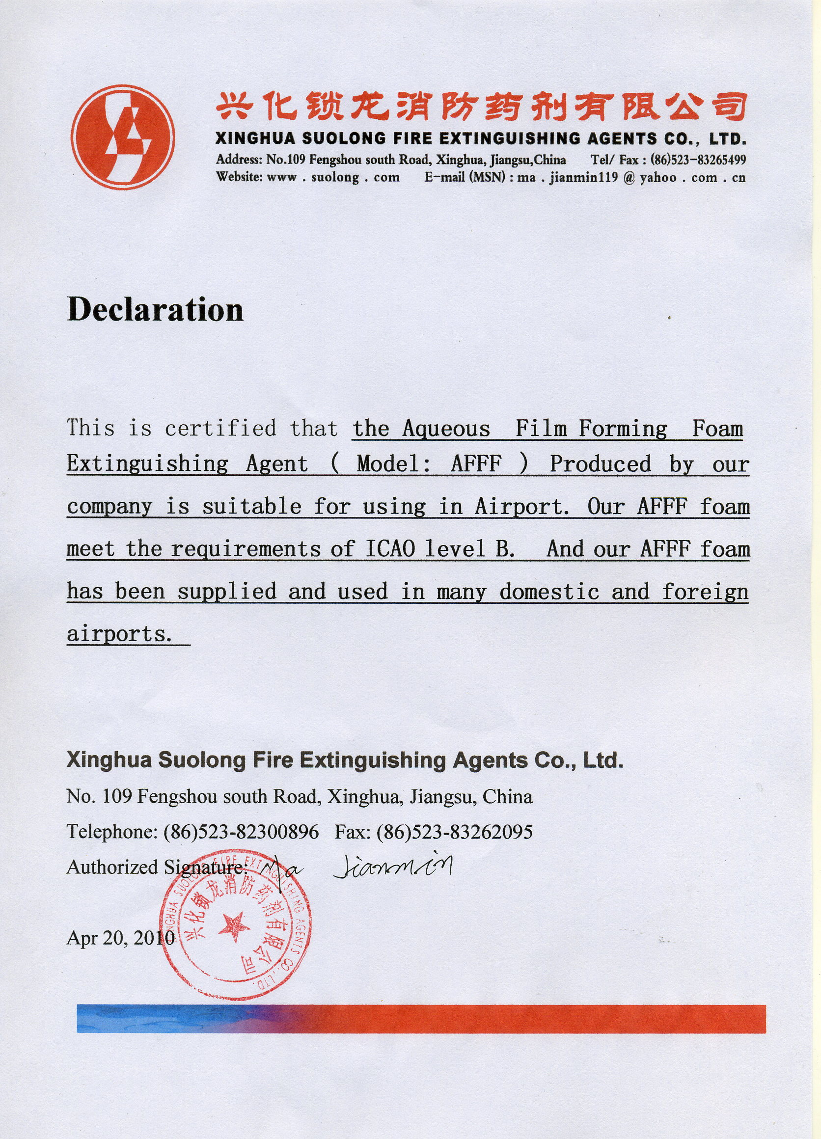 NINGBO Suolong. Við hófum innflutning á slökkviefnum frá Kína árið 2008 og eingöngu frá einum aðila Suolong en það er langstærsti framleiðandi á slökkviefnum í Kína. Það á við bæði um slökkvifroður og slökkviduft. Verksmiðjan er 36.000m2 og var stofnuð 1967. Framleiðslan hefur hlotið allar helstu viðurkenningar og m.a. viðurkenningu IMO (International Code for Fire Safety Systems). Þeir flytja út til yfir tuttugu landa í öllum heimsálfum. Slökkviefni frá þeim er á helstu flugvöllum í Kína, olíhreinsunarstöðvum og olíupöllum.