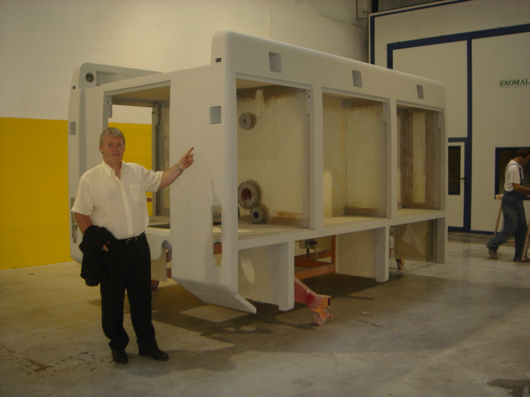 Hér má sjá yfirbyggingu úr trefjaplasti á Steyr undirvagn en þessar bifreiðar fara til Tælands. Mjög sérstök yfirbygging,