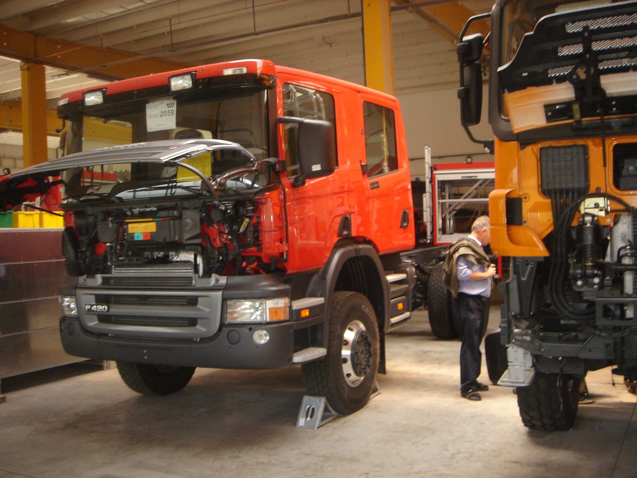 Hér standa slökkvistjórarnir við hlið Scaníunnar en vinna var hafin við hana. Þetta er Scania P420 beinskipt með tvöföldu