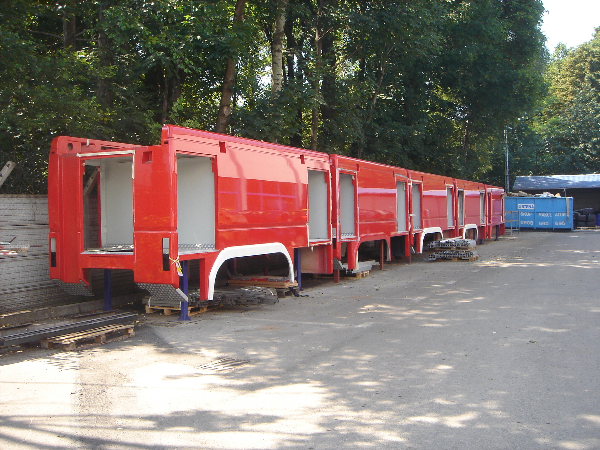 Yfirbyggingin fyrir Austurbyggð var að fara í sprautun en undirvagn frá Scania nýkominn.