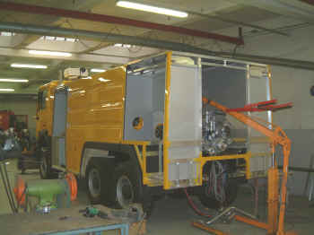 Verið er að byggja yfir undirvagninn hjá ROSENBAUER í Flekkefjörð í Noregi. ROSENBAUER sem er mjög þekktur framleiðandi á